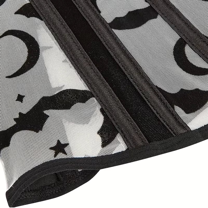 Les jeux de transparence et les motifs chauve-souris font de ce corset ornemental une pièce unique. Il est ajustable grâce aux lacets dans le dos. Il se porte de préférence au-dessus d'une chemise blanche. Le corset vient marquer votre taille et la sublimer. Sa coupe vient épouser le corps jusque sous le buste sans compresser la poitrine.