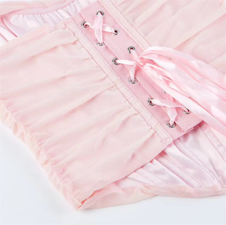 Dans le dos, les finitions soignées révèlent un magnifique effet plissé, apportant du volume et un raffinement unique. Les lacets satinés, glissant élégamment à travers de fins œillets, permettent d’ajuster le corset à votre morphologie tout en ajoutant une note de glamour discret.
