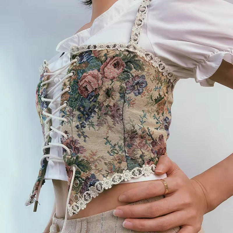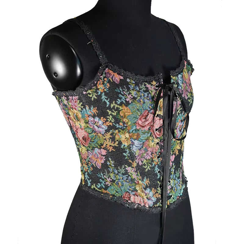 Ce corset peut se porter comme pièce maîtresse ou par-dessus un chemisier blanc à manches longues. Vous êtes féminine et classe en toutes circonstances. On retrouve l'élégance des dames des années 60-70. Les lacets sont ajustables et permettent de créer ou non un décolleté.