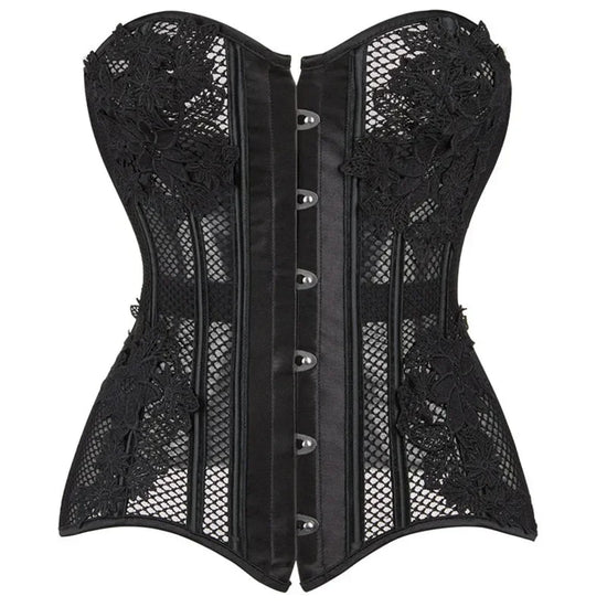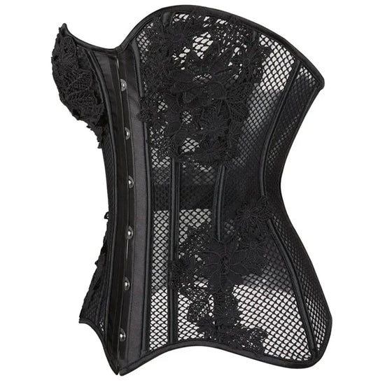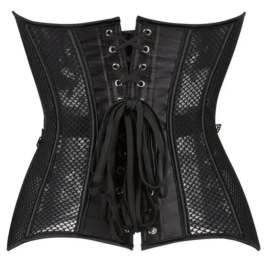 Grâce aux longs lacets noirs situés dans le dos, vous avez la possibilité d'ajuster le corset selon vos besoins. La résille présente sur tout le tour du corset, offre un jeux subtil de transparence.