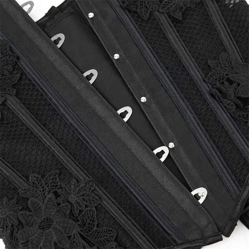 Ce corset en dentelle noire allie transparence et élégance dans un subtil jeu de contrastes. La résine translucide, délicatement recouverte de motifs floraux brodés, offre une touche de mystère tout en apportant plus de couvrance.