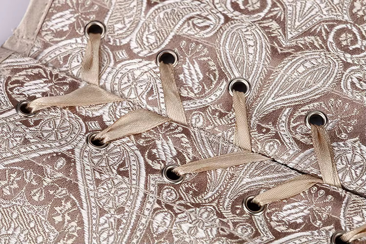 Il y a une fermeture éclair pratique sur le côté du corset afin de pouvoir l'ouvrir facilement et sans contrainte. Les motifs blancs sur fond doré ajoutent une touche de luxe à cette pièce maîtresse.