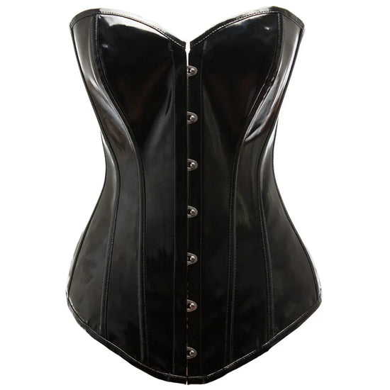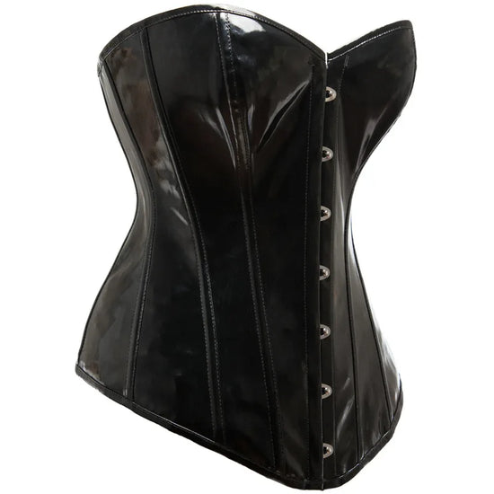Sculptez votre silhouette avec audace grâce à ce corset en vinyle noir brillant, aussi élégant que sensuel.