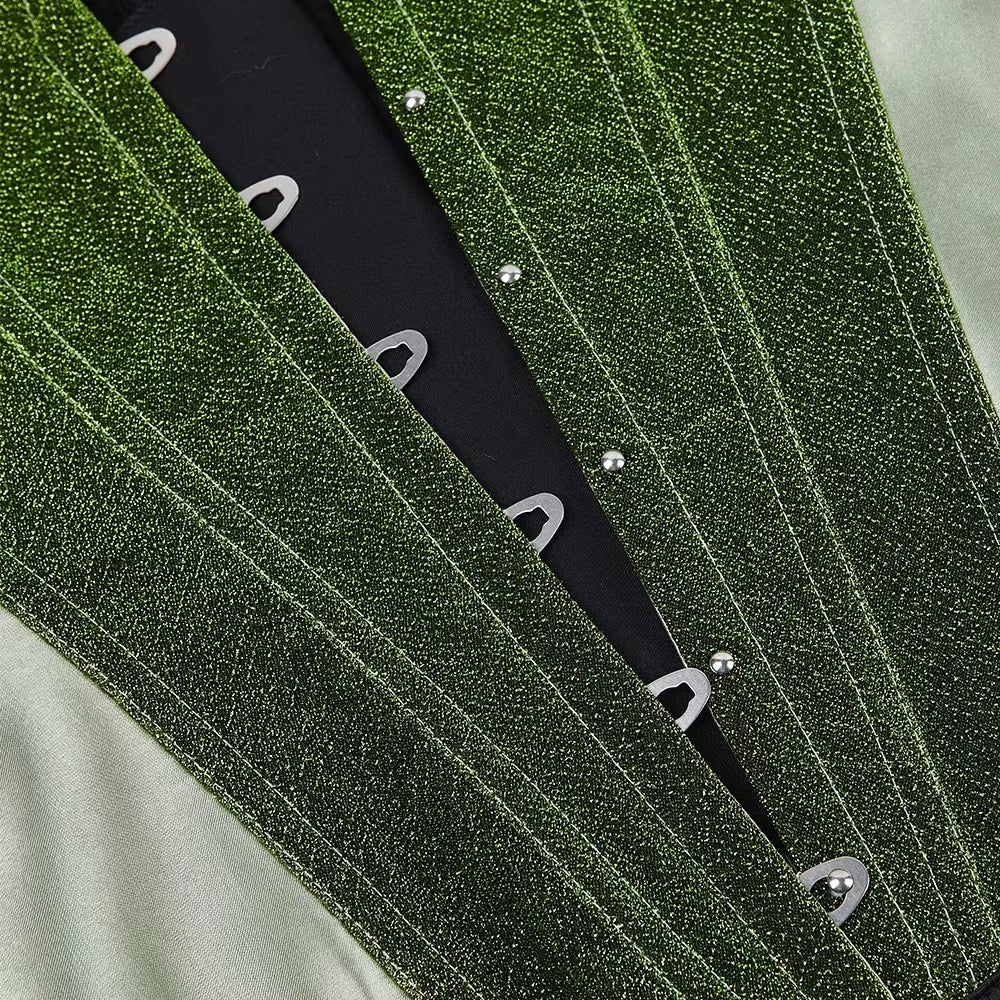 Conçu dans une matière satinée brillante, il capte la lumière et apporte une touche glamour irrésistible. Sa coupe pigeonnante met en valeur la poitrine avec délicatesse, tandis que le laçage au dos apporte une finition sophistiquée et ajustable, pour épouser parfaitement la silhouette.