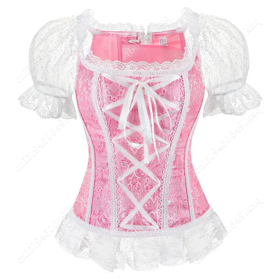 Ce corset princesse associe la tendresse du rose à la pureté du blanc pour un style à la fois délicat et raffiné. Confectionné en dentelle élégante, il se distingue par ses tailles travaillées et ses manches courtes bouffantes, qui apportent une touche romantique irrésistible.