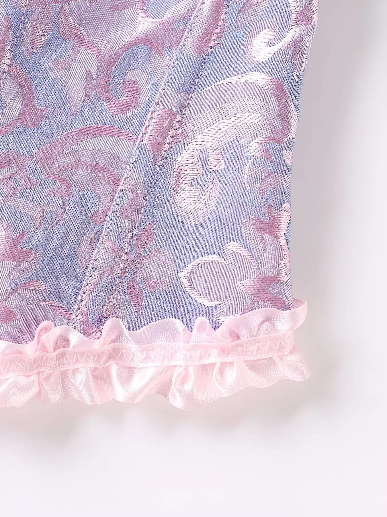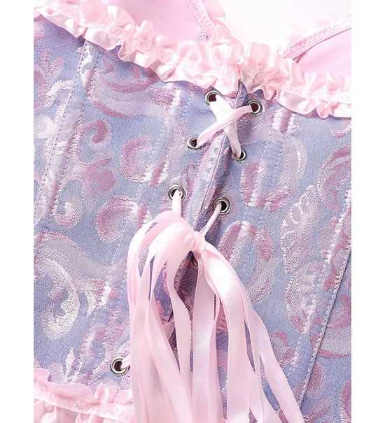 En bordure, de délicats volants rose pâle façon princesse ajoutent une touche romantique et féminine, tandis que l’avant du corset est doté de pratiques agrafes pour l’enfiler et le retirer facilement, sans compromettre le confort.