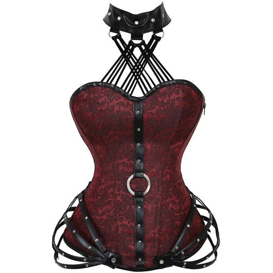 Osez aussi la couleur sombre du corset rave rouge toujours accompagné de ses lanigères et tour de cou en cuir noir. Une pièce unique et originale pour vos soirées.