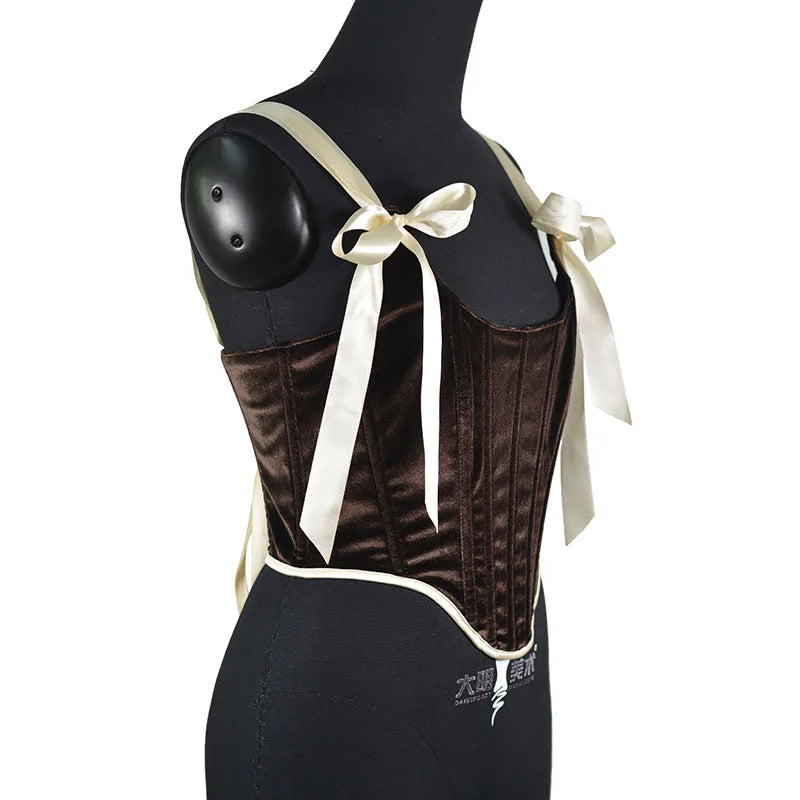 Sublimez votre silhouette avec l’élégance intemporelle de ce corset en velours brun très foncé. Sa texture riche et soyeuse épouse les formes avec raffinement, tandis que ses coutures blanc crème apportent une touche de contraste délicat et sophistiqué.