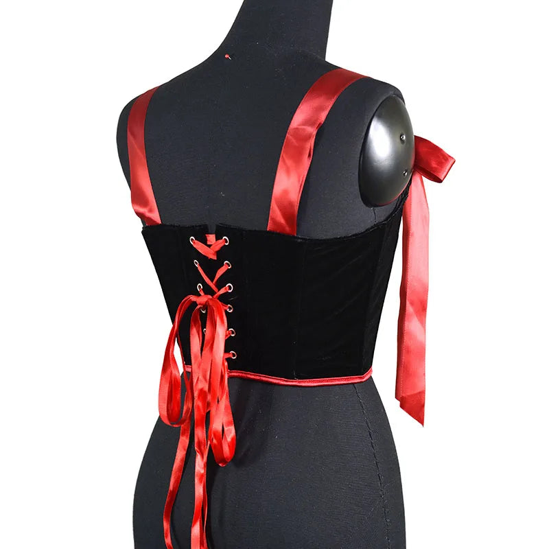 Le contraste saisissant des coutures rouges au bas du corset attire le regard, tandis que les bretelles en ruban rouge insufflent une note ardente et raffinée. Dans le dos, le lacet rouge flamboyant ajoute une touche dramatique et sensuelle, permettant d’ajuster la coupe à votre silhouette avec élégance.