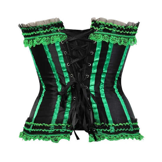 Succombez au charme envoûtant de ce corset vert et noir, une pièce unique qui sublime la silhouette avec raffinement. Son design délicat allie noir profond et touches de vert éclatant, mettant en valeur ses armatures grâce à de fines coutures vertes qui soulignent les courbes avec élégance.