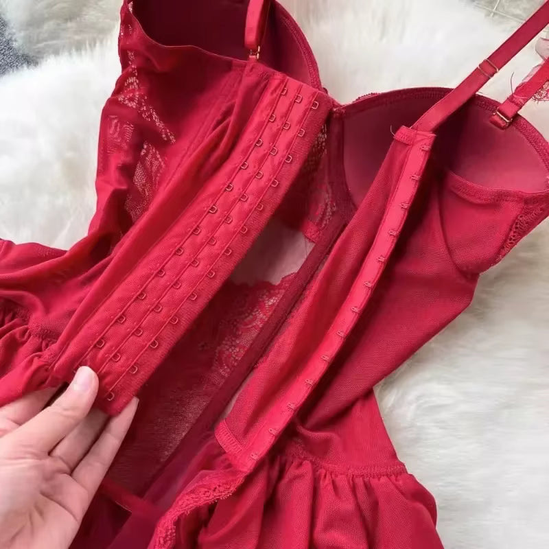 Ce corset rouge au design raffiné est accompagné de son jupon intégré pour une allure à la fois sensuelle et sophistiquée.