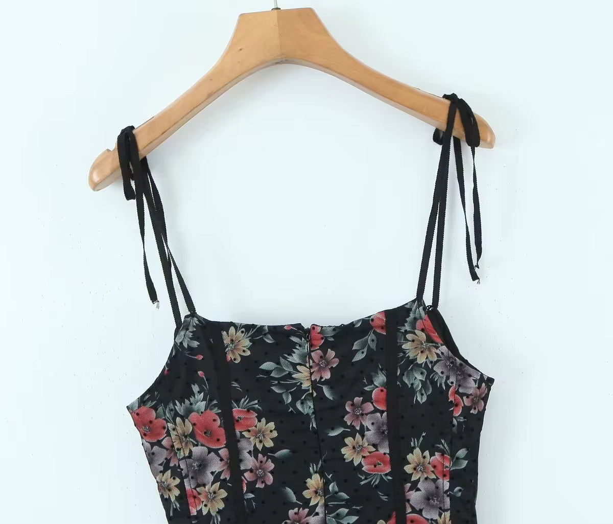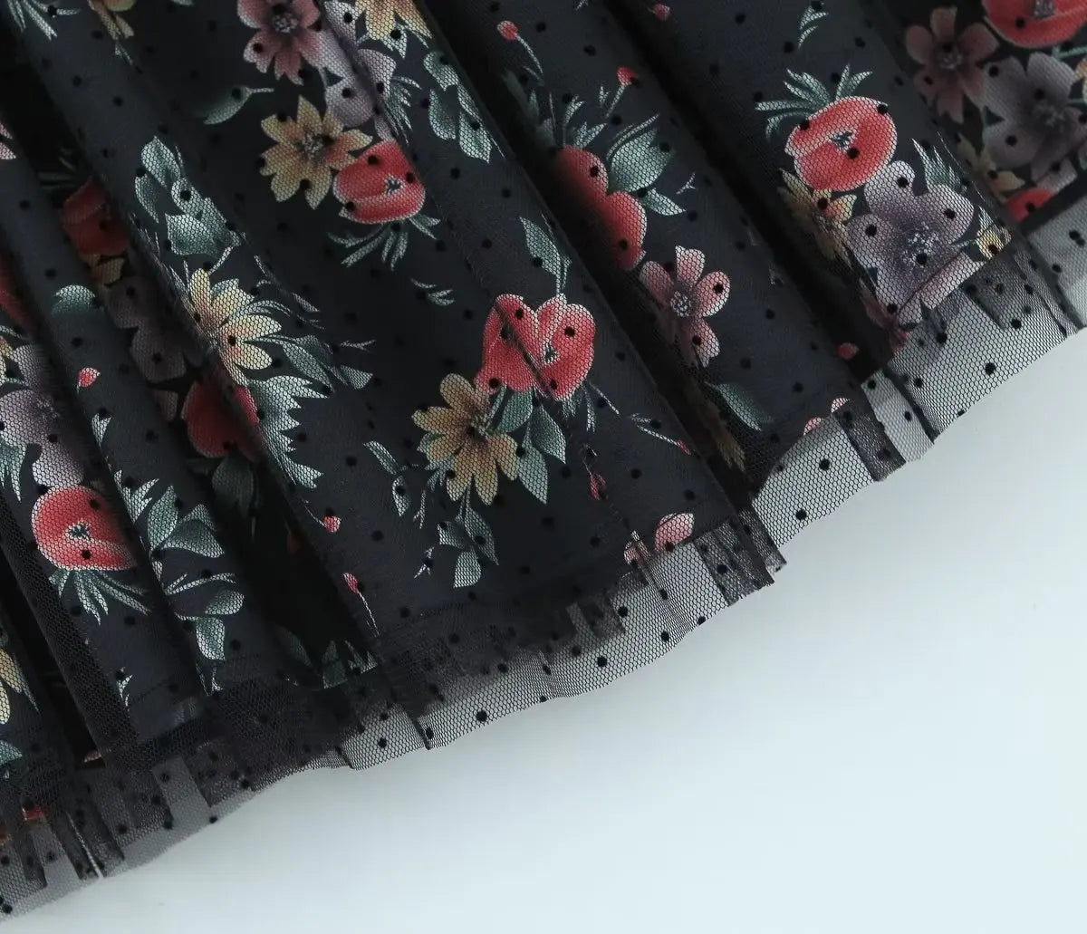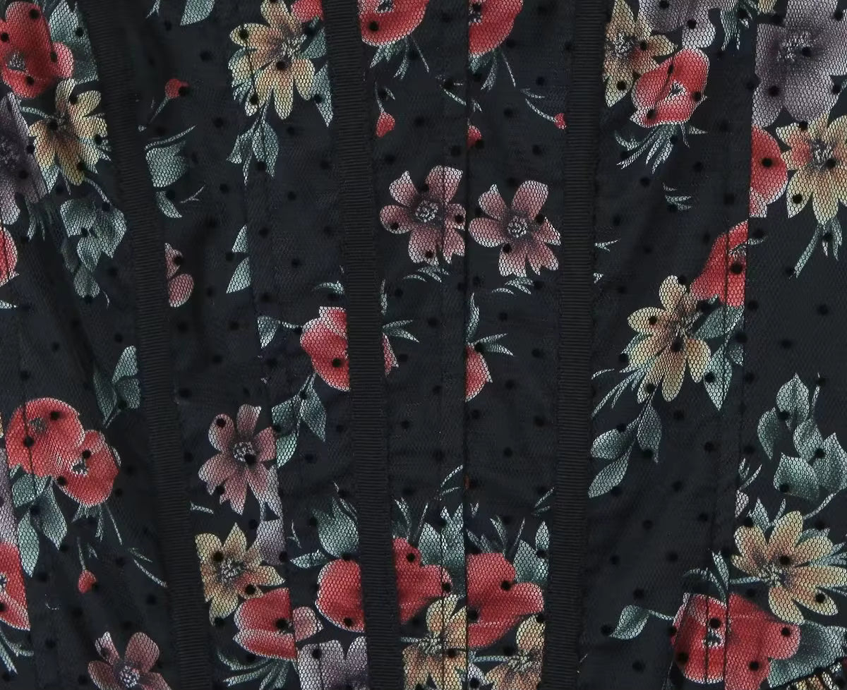Son tissu noir, parsemé de motifs floraux éclatants aux tons rouges, roses et jaunes, met en valeur la fraîcheur et la féminité.